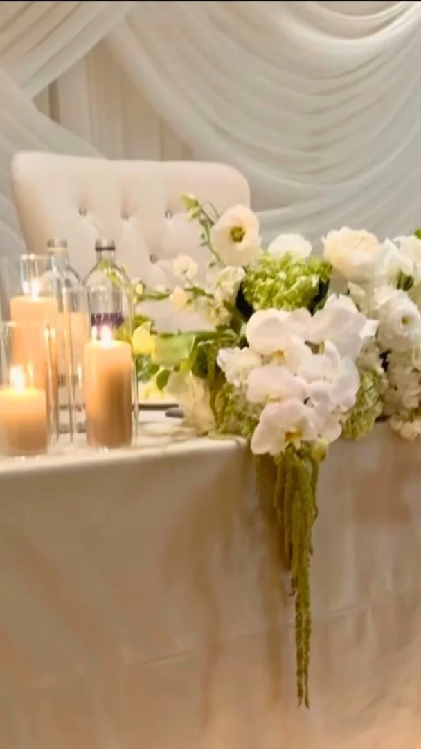 Think white orchids, ranunculus, roses, and helebores paired with soft greenery or bleached accents. Add sculptural candles or crystal glassware to amplify the look’s luxury.