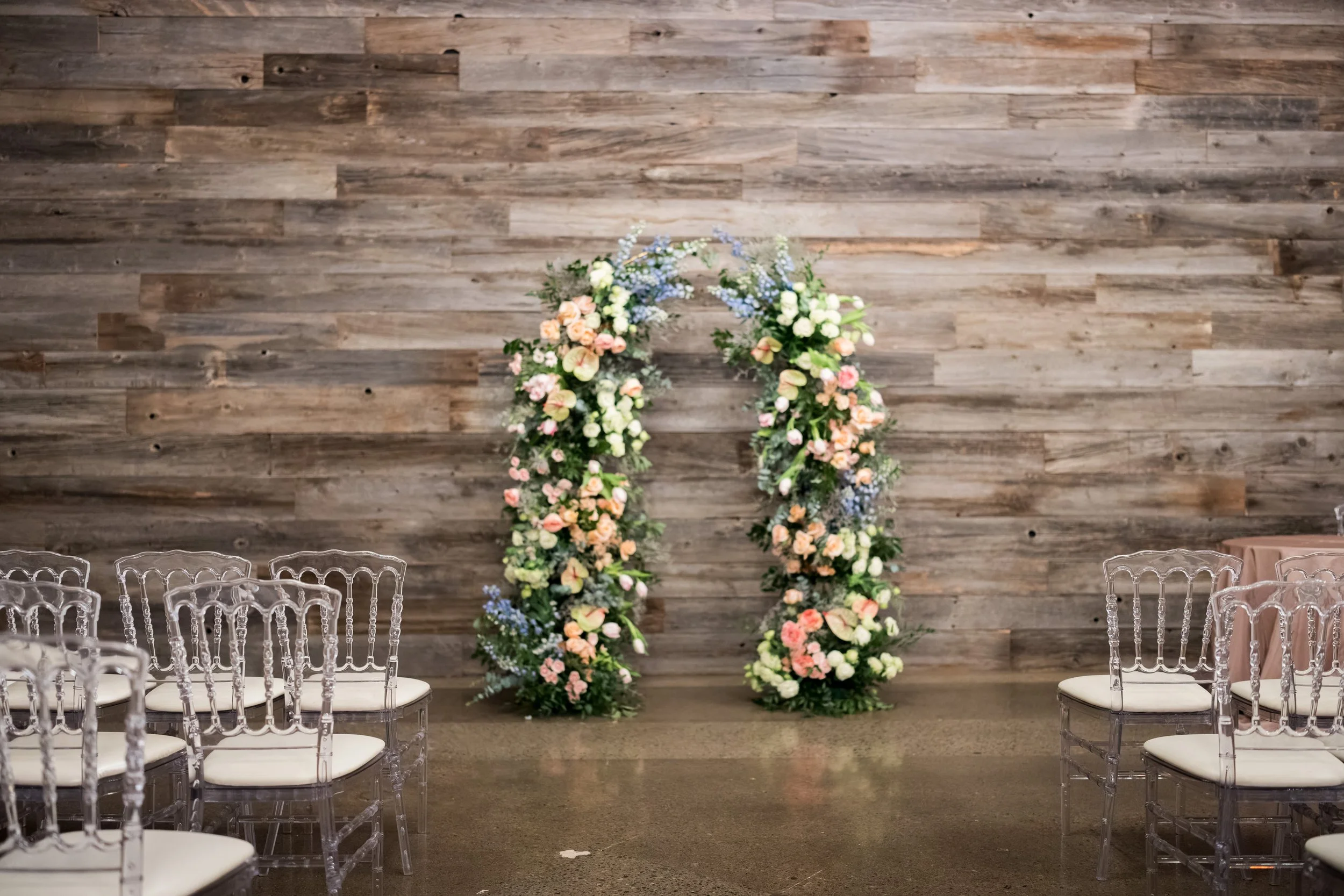 We began with a base of lush greenery, layering in florals in intentional groupings to create a modern, asymmetrical composition. This approach offered a fresh interpretation of a classic ceremony structure, allowing for movement and visual interest without feeling overly traditional.