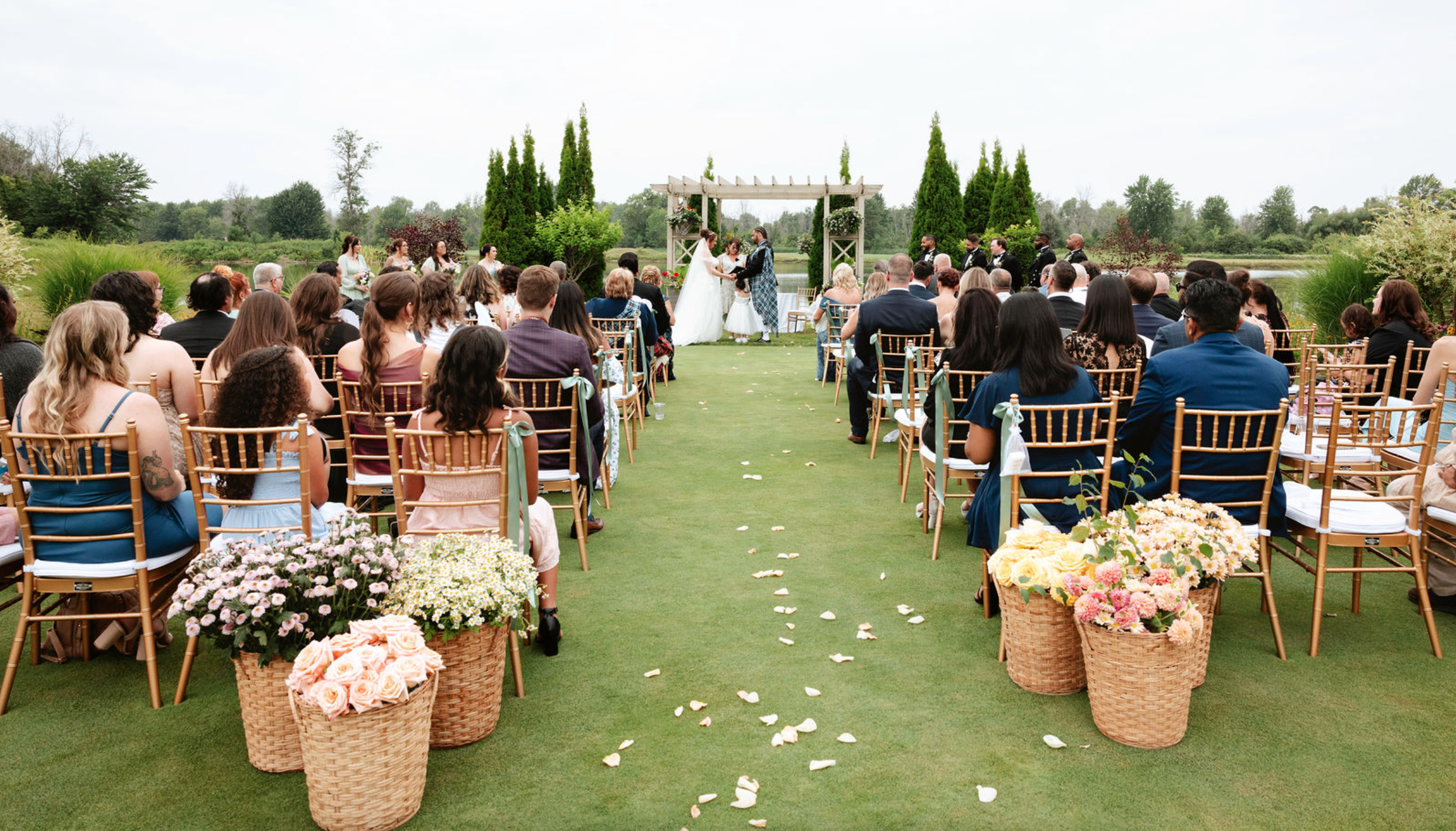 We created a series of bespoke floral baskets filled with fresh, seasonal blooms and placed them at the start of the aisle. The design framed the ceremony space while allowing the surrounding landscape to remain the focal point.
